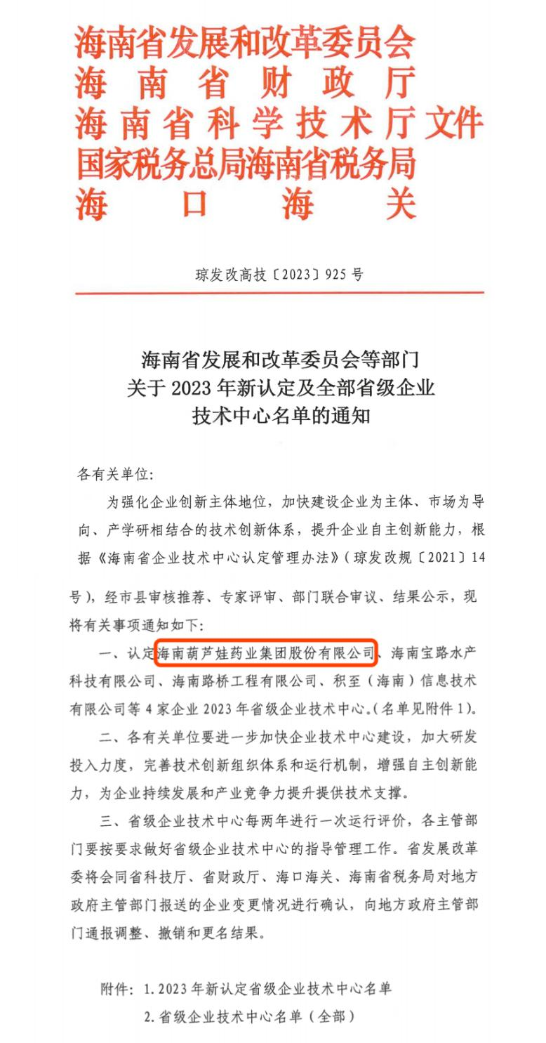 近日,海南省发改委等多部门联合公布了《关于2023年新认定及全部省级企业技术中心名单的通知》,其中,海南拉斯维加斯药业集团股份有限公司成功通过评审,被认定为省级企业技术中心,是本次获批的4家企业之一。